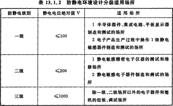 13.1.2 防靜電環(huán)境設計應按電子產品或生產工序(設備)進行分級。防靜電環(huán)境內靜電電位絕對值應小于電子產品的靜電電位安全值。防靜電環(huán)境設計應分為三級,防靜電環(huán)境設計分級適用場所應符合表13.1.2的要求。