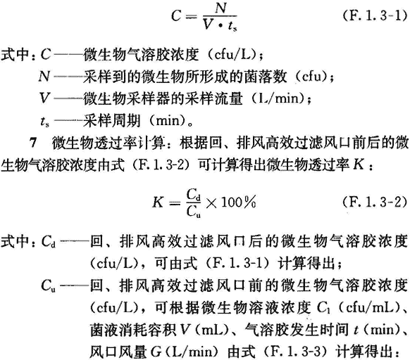 1 制定方案:明確評價任務,制定詳細的評價方案,包括確定微生物氣溶膠、發(fā)生器所需的菌液濃度、潔凈壓縮空氣流量,確定在回、排風高效過濾風口出風端的微生物采樣周期、采樣次數(shù)等,一般可根據(jù)回、排風高效過濾風口的塵埃顆粒物過濾效率進行計算。