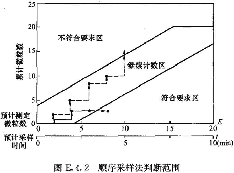 13 對于需要很大采樣量、耗時很大的某粒徑微粒的檢測,可采用順序采樣法,即將每次測定結(jié)果標注于圖E.4.2上,當標注點落入不合格區(qū)時,即停止檢測,結(jié)果為不達標;當標注點落入合格區(qū)時,停止檢測,結(jié)果為達標;當標注點一直在繼續(xù)區(qū)中延伸,而總采樣量已達到表E.4.2—2的最小采樣量,累計微粒數(shù)仍小于20,即停止檢測,結(jié)果為達標;當標注點一直在繼續(xù)區(qū)中延伸,而總采樣量未達到最小采樣量,但累計微粒數(shù)已超過20,即停止檢測,結(jié)果為不達標。