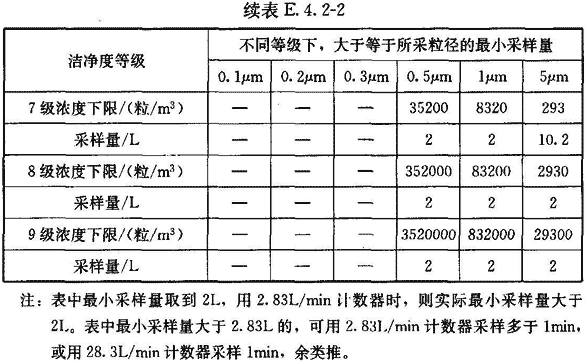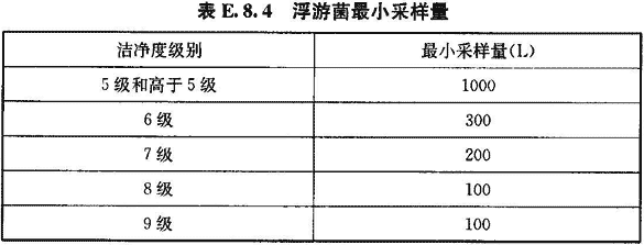 4 每點采樣1次,如工藝無特殊要求,每次采樣量應大于等于表E.8.4推薦的浮游菌最小采樣量。