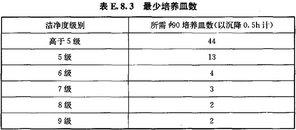 7 培養(yǎng)皿數(shù)應不少于微粒計數(shù)濃度的測點數(shù),如工藝無特殊要求應大于等于表E.8.3中的最少培養(yǎng)皿數(shù),另外各加1個對照皿。