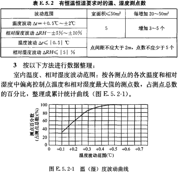 2)根據(jù)溫度和相對濕度波動范圍(表E.5.2),應選擇相應的具有足夠精度的儀表進行測定。根據(jù)由低到高的精度,測定宜連續(xù)進行(8~48)h,每次測定間隔不應大于30min;