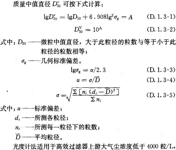 D.1.3 光度計法可用于最大穿透率大于等于0.001%的過濾器檢漏,應采用多分散的檢漏氣溶膠,其質(zhì)量中值直徑為0.5μm~0.7μm,幾何標準偏差約為1.7。