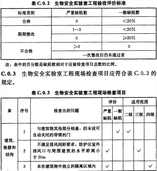 C.0.2 生物安全實(shí)驗(yàn)室工程驗(yàn)收評(píng)價(jià)標(biāo)準(zhǔn)應(yīng)符合表C.0.2的規(guī)定。