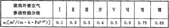 式中:α1——外門窗縫隙滲風(fēng)系數(shù)[m3/(m·h·pab)],當(dāng)無(wú)實(shí)測(cè)數(shù)據(jù)時(shí),可根據(jù)建筑外窗空氣滲透性能分級(jí)的相關(guān)標(biāo)準(zhǔn),按表F.0.3采用;