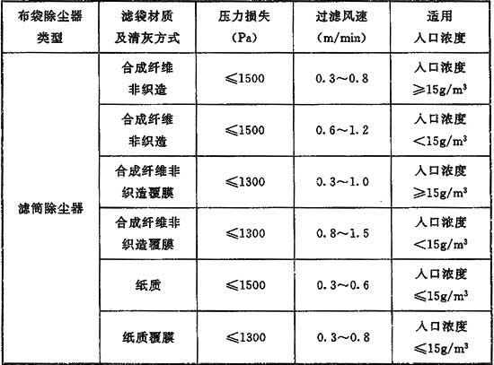 表3 各類(lèi)布袋除塵器過(guò)濾風(fēng)速和壓力損失