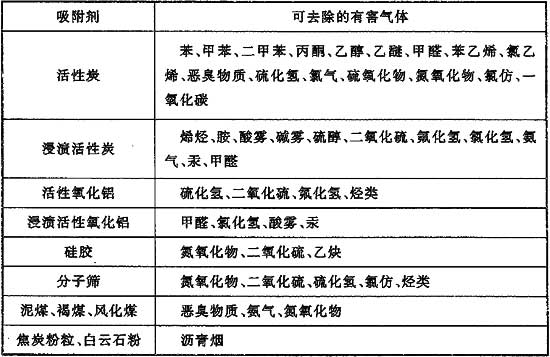 常用的吸附劑有活性炭、硅膠、活性氧化鋁或分子篩等?;钚蕴渴菓?yīng)用較廣泛的一種吸附劑,特別是經(jīng)浸漬處理后,應(yīng)用更加廣泛。硅膠等吸附劑稱(chēng)為親水性吸附劑,用于吸附水蒸氣和氣體干燥。各種吸附劑可去除的有害氣體見(jiàn)表6。